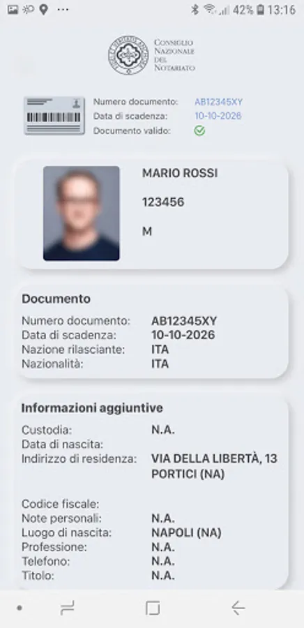With NotaryID you can extract, in total autonomy, the personal data directly from the Electronic Identity Card (CIE) or from the Electronic Passport (PE). By scanning the document - by means of the camera and the NFC reader of the smartphone - the app is able to acquire the personal data contained in the CIE and PE and send them to the notary who requests them for the uses permitted by law.