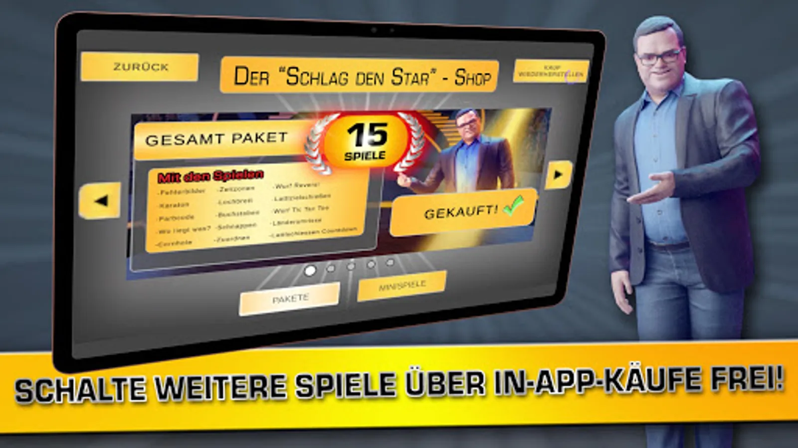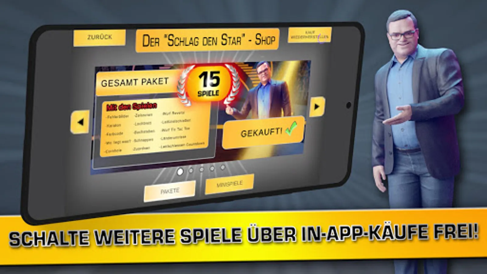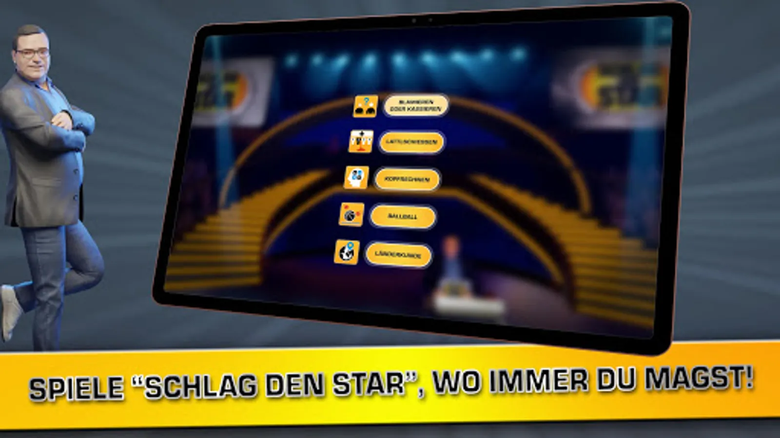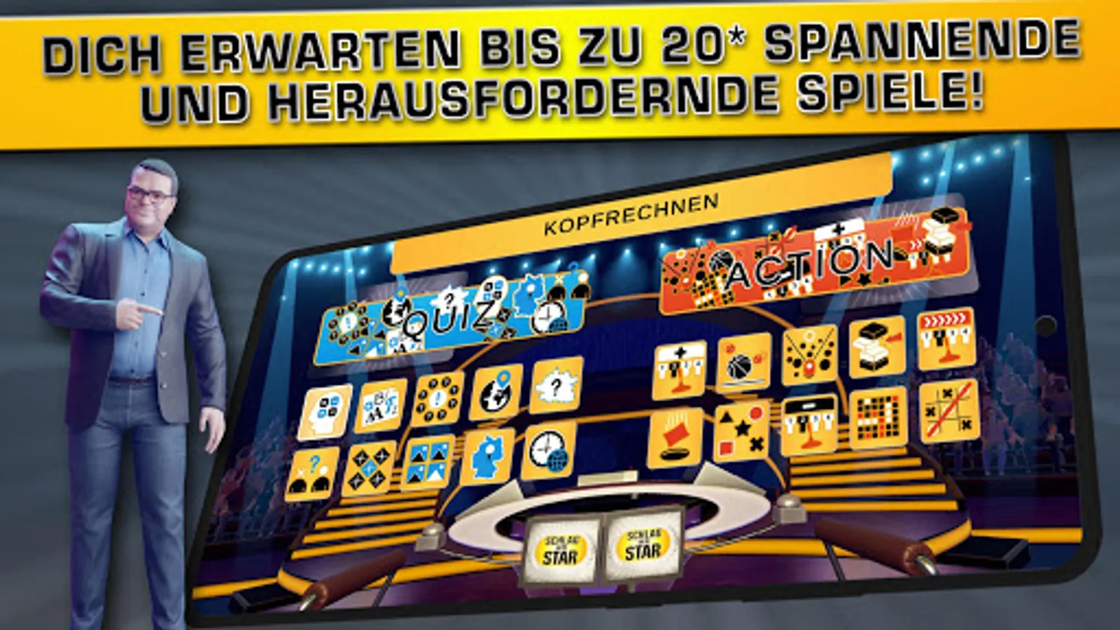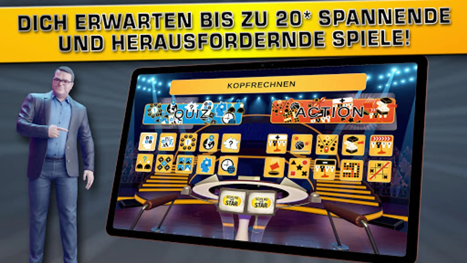 It's finally here - after SCHLAG DEN RAAB it's time for the next round. BEAT THE STAR and Elton take the stage and take you to a new level. We have completely rebuilt the studio so that it is now more beautiful and realistic than ever. Create your own character and compete with him in the new, exciting and challenging games. Whether it's "mental arithmetic", "matching" or "letters" - brains and a quick finger are clearly required here. "Lattlschiessen", "Wurf Reversi" or "BallBall" are all about good timing, but above all about instinct. Of course, there was no refraining from “embarrassing or cashing in” and Elton also leads through the show with confidence as usual. Only those who can prove themselves to be all-round talents have a chance of winning.