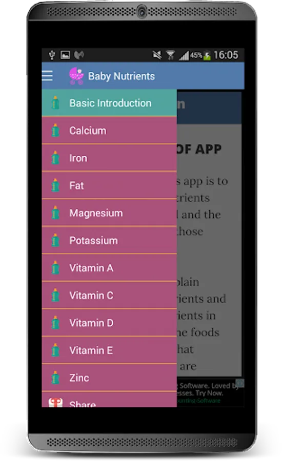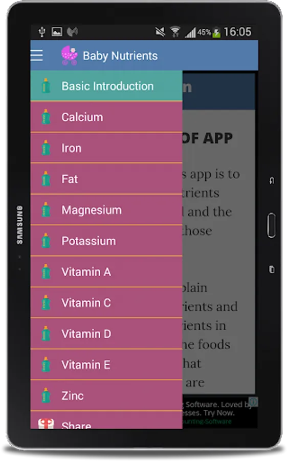 For at least four months of age, your baby gets all the nutrition he or she needs from breast milk or infant formula. But as your baby grows, he or she will need nutrients from solid sources. This app contains information about mineral that build children bones and teeth strong, helps healthy nerve and muscle function.