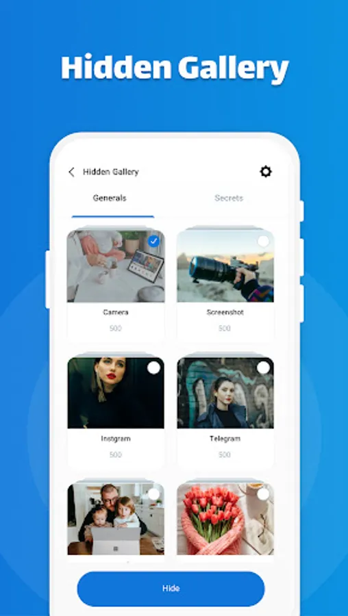 Hides your photos and videos, and opens in BitBaan by pattern, PIN or password.