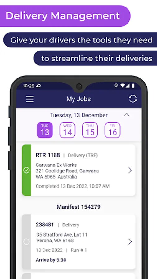 • After logging into their account, each driver gets a quick summary of today's deliveries as well as the days ahead. This allows your drivers to prepare their week and adapt to changes in their runs.
