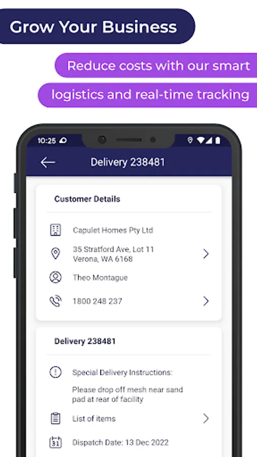 • The full details for each delivery are accessible with a tap, including delivery instructions, contact options for the customer, and live map navigation to the site.
