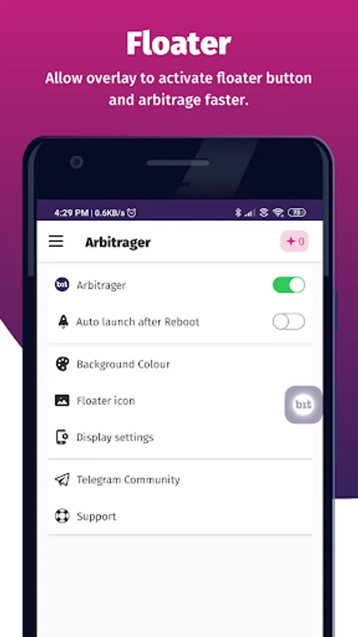 Just enable overlay for Arbitrager and enjoy the better way of arbitraging. Overlay allows you to enable a floating Arbitrager button for quick access by drawing over other cryptocurrency exchange apps.