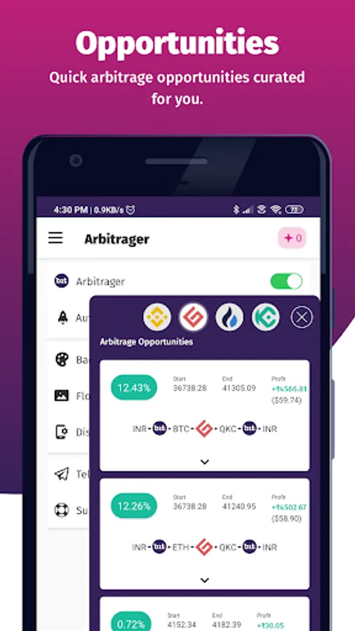 Get the Arbitrager app (powered by Bitbns) and feel the most empowering arbitrage experience in crypto, ever. Just enable app overlay for Arbitrager floater button and set up the fastest arbitrage trades with trade panels from Binance, Huobi, gate.io, Kucoin and more, in parallel.