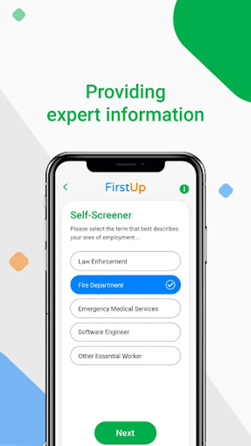 This app provides a self-assessment of your risk for current pandemic infection based on the latest guidance from faculty medical experts at FirstUp.
