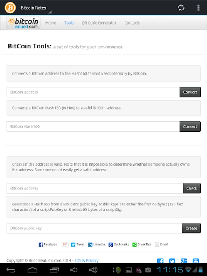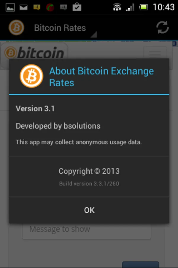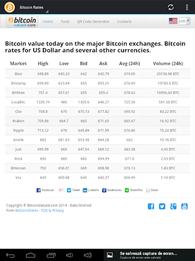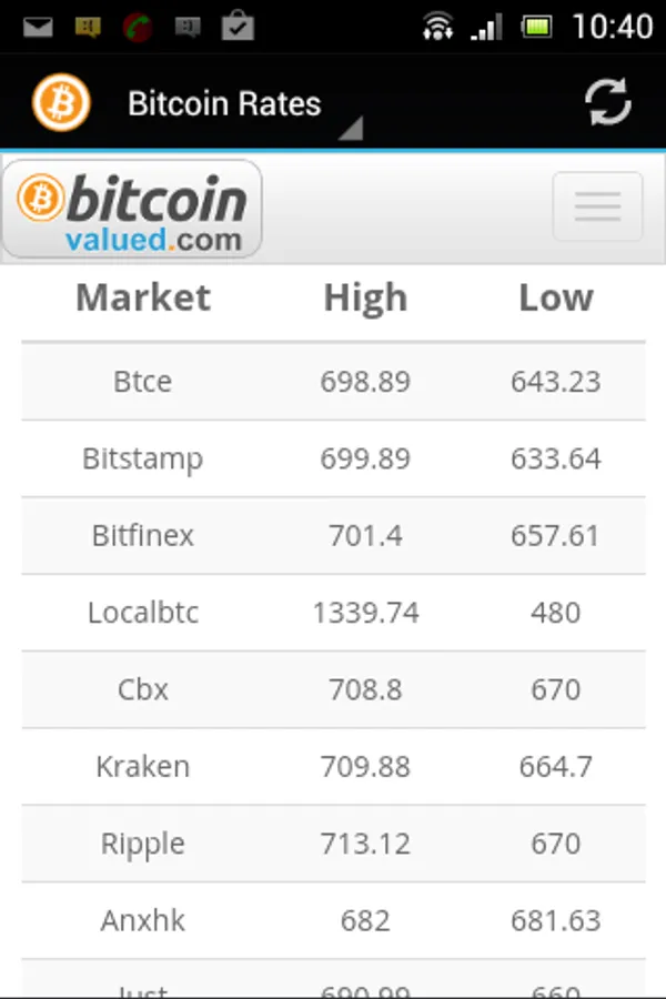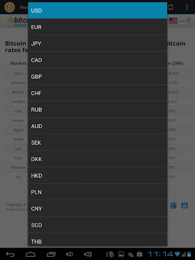 Get Bitcoin exchange quotes against USD, EUR, GBP, JPy, CAD, CHF, RUB, AUD, SEK, DKK, HKD, PLN, CNY, SGD, THB, NZD and NOK. The user can see the low and high price, bid and ask prices, 24h average price and 24h volume on several Bitcoin Exchange markets.