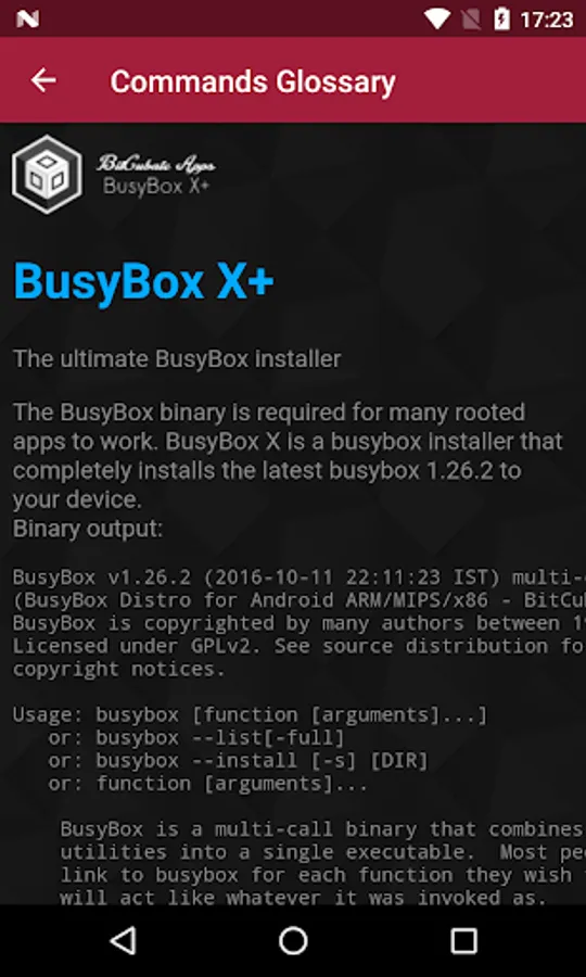 BusyBox X Includes the latest BusyBox binary v1.26.2 and supports 388 applets (highest among any BusyBox Installer), the most complete set of functions. Supports installation of BusyBox from the application and via recovery from zip archive (see "Menu - Zip archive"). Tested and Working on Android 7 Nougat.