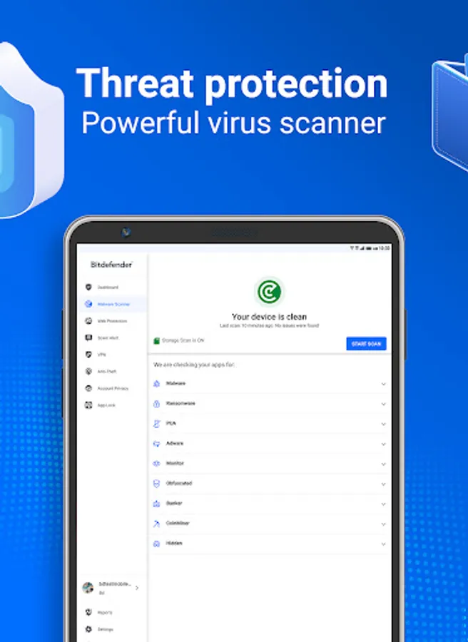 Security and privacy combined: Bitdefender Mobile Security keeps your Android phone and tablet protected from all online threats. If you're looking for a virus cleaner or malware removal tool, look no further.