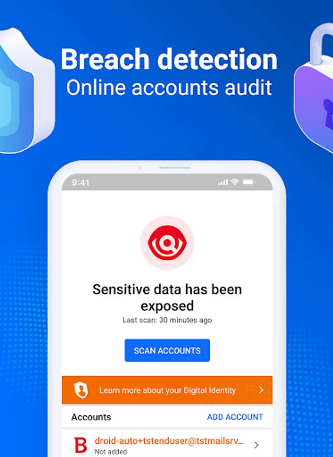 ✔ Identity Protection - scans all corners of the web for account and password leaks, alerting you in case of account breaches.