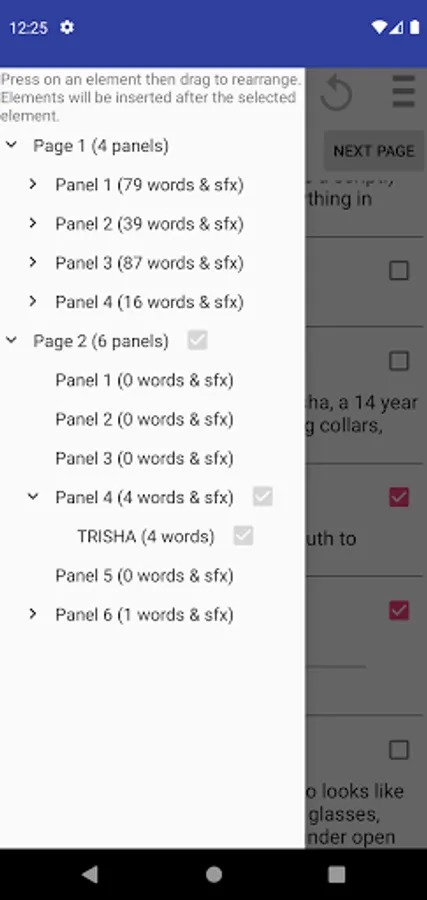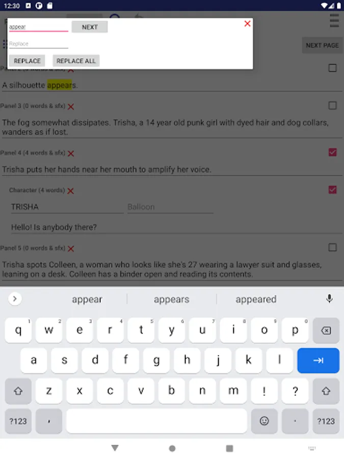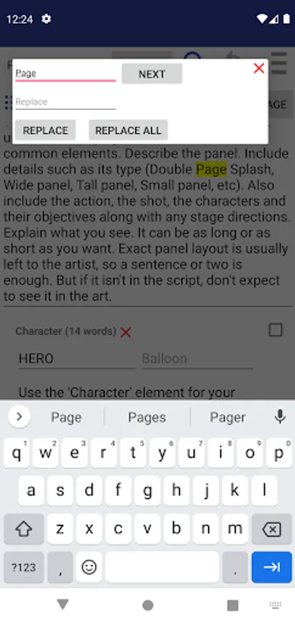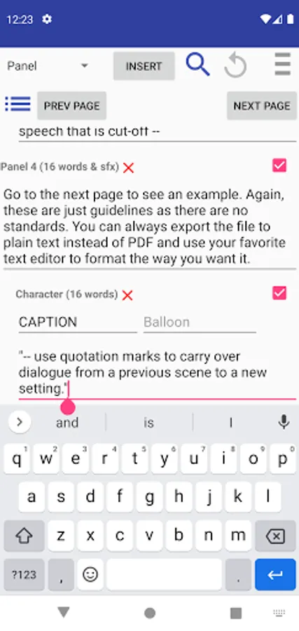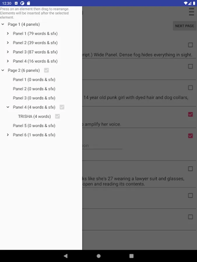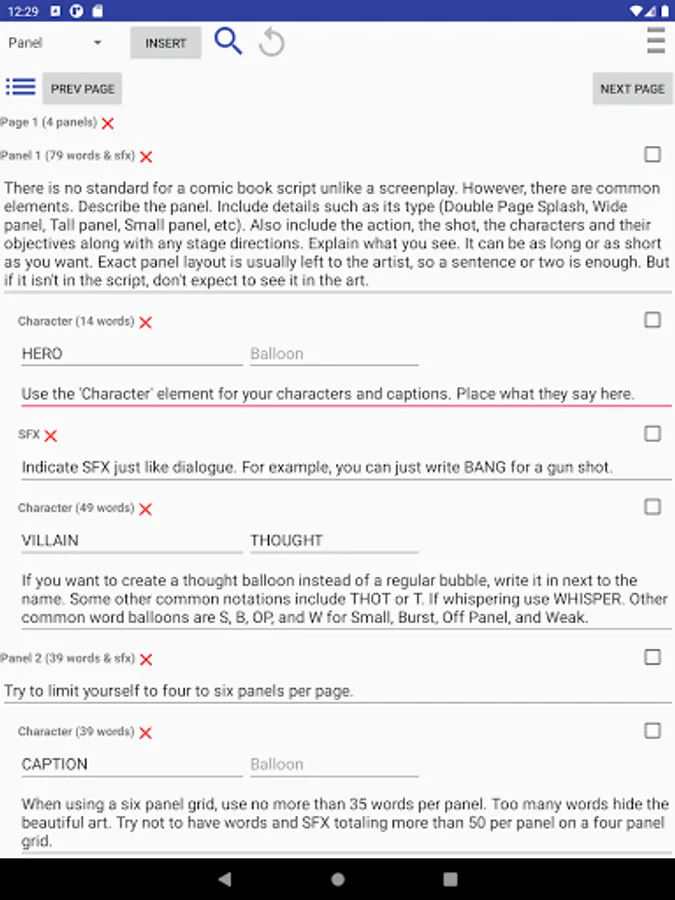 Comic Book Script Writer is a writer tool that helps create comic book and graphic novel scripts. It automatically formats and numbers your pages and panels so you don't have to edit them each time you reorder them. Just drag and drop on the navigation drawer. It also counts the words in a dialogue and how many words in a panel so you don't have to keep track of it yourself.