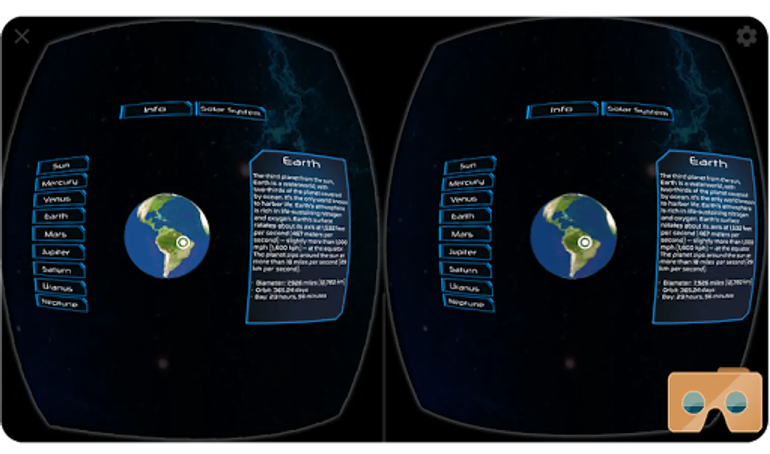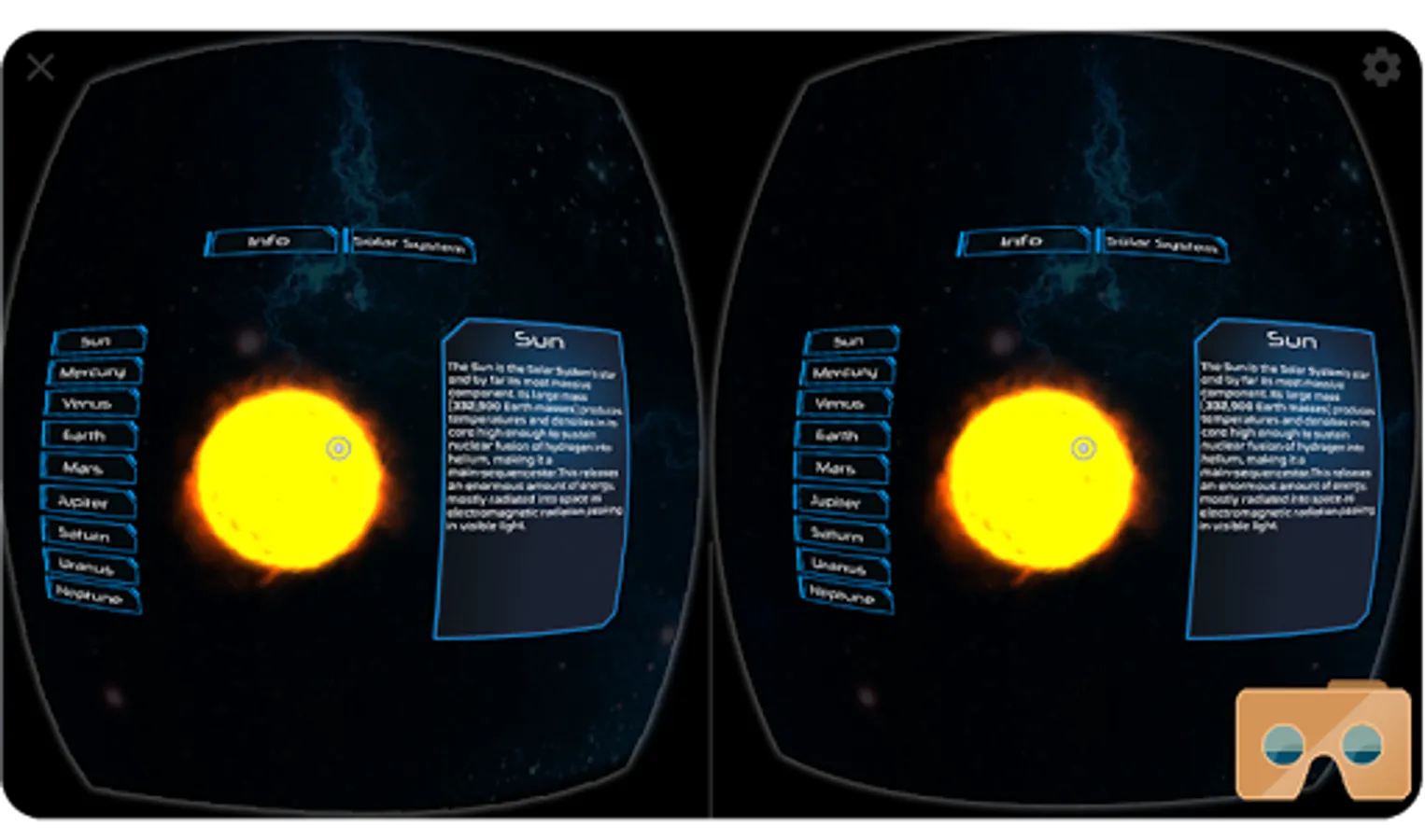 It is a virtual reality journey through space in our solar system, you will have the possibility to travel to each planet of our system and learn from them like never before. Just put your phone in the Cardboard and enjoy.