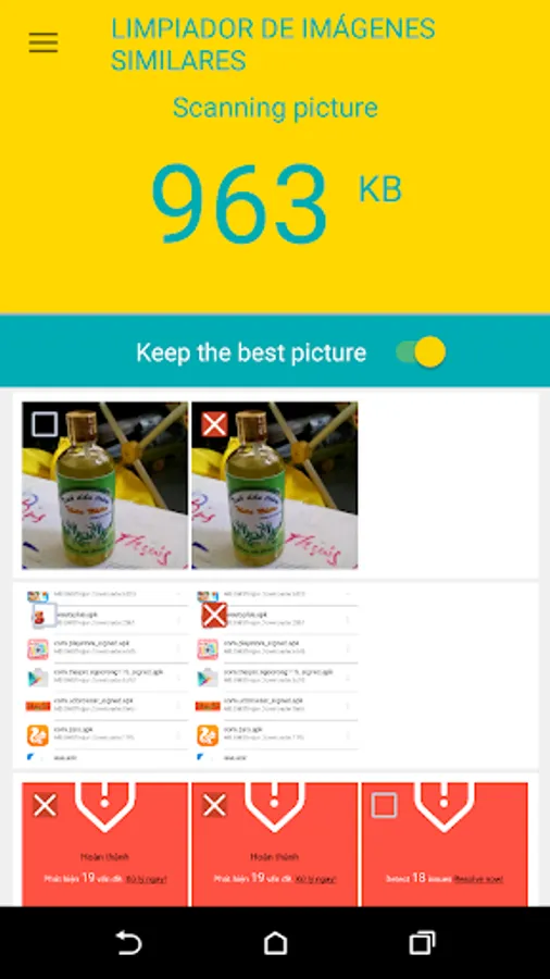 Delete similar images: Scans gallery and shows similar images in groups. The user can select a similar image to erase.