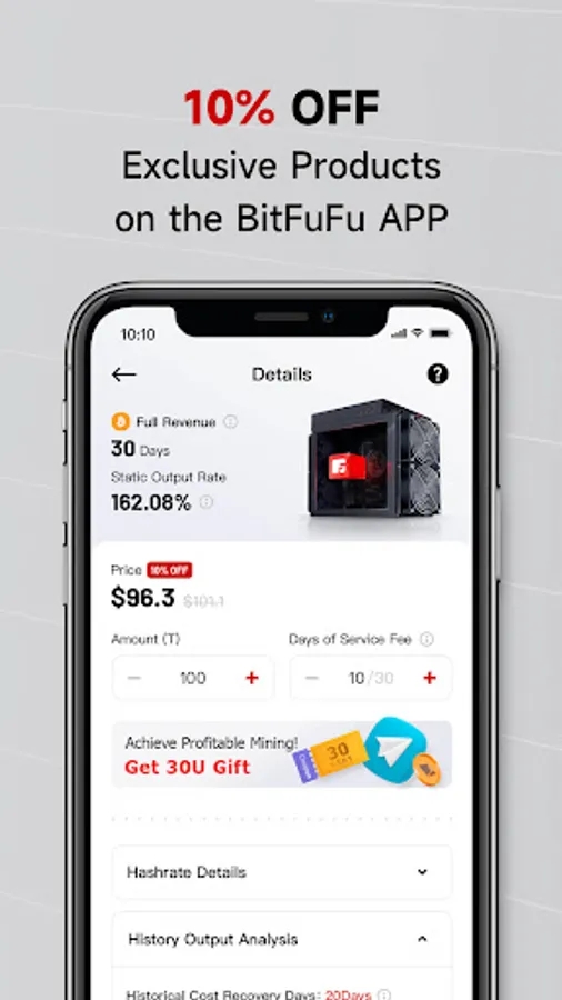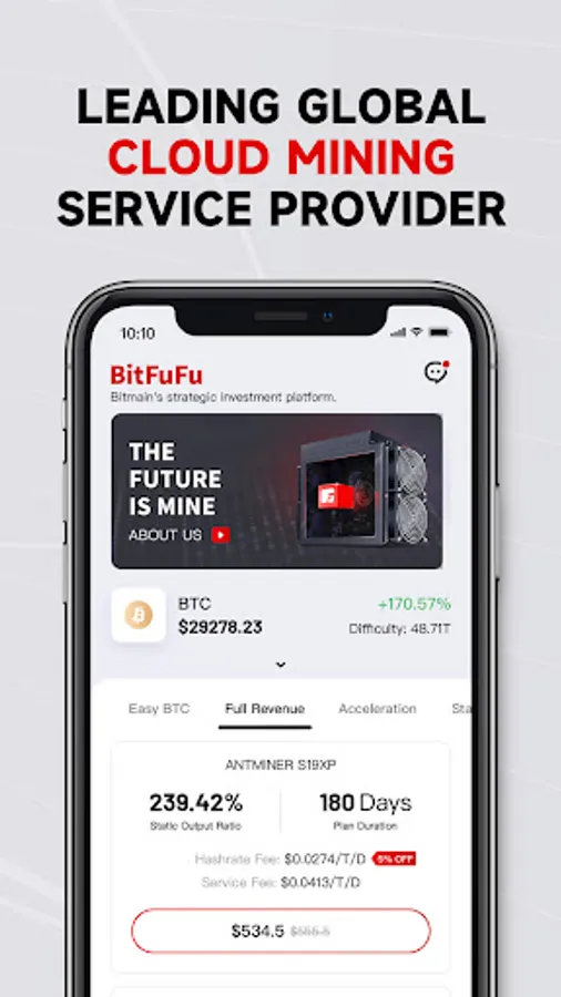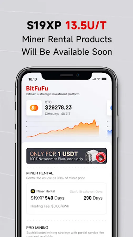 BitFuFu is invested in by Bitmain, the world's leading cryptocurrency mining hardware manufacturer and is currently the only strategic partner for cloud mining. The BitFuFu platform provides one-stop Bitcoin mining services, including cloud mining, mining machine leasing, sales, and hosting, offering various product solutions for cryptocurrency users, miners, and institutional users. With just one click, you can experience effortless cloud mining, leaving the complicated purchasing, transportation, hosting, and maintenance of the equipment for us.