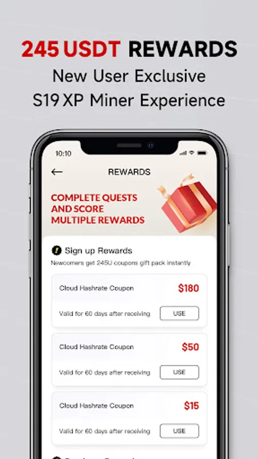 New users can enjoy a discount of 245 USDT and experience the S19 XP miner for one day exclusively.