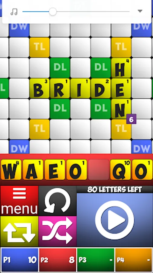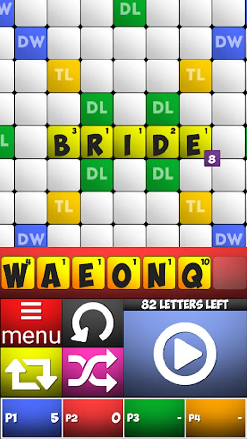 Word Game can be played with 2 to 4 players. Word Game object is to score more points than one's opponent. A player collects points by placing words on the game board. Each letter has a different point value, so the strategy becomes to play words with high scoring letter combinations.