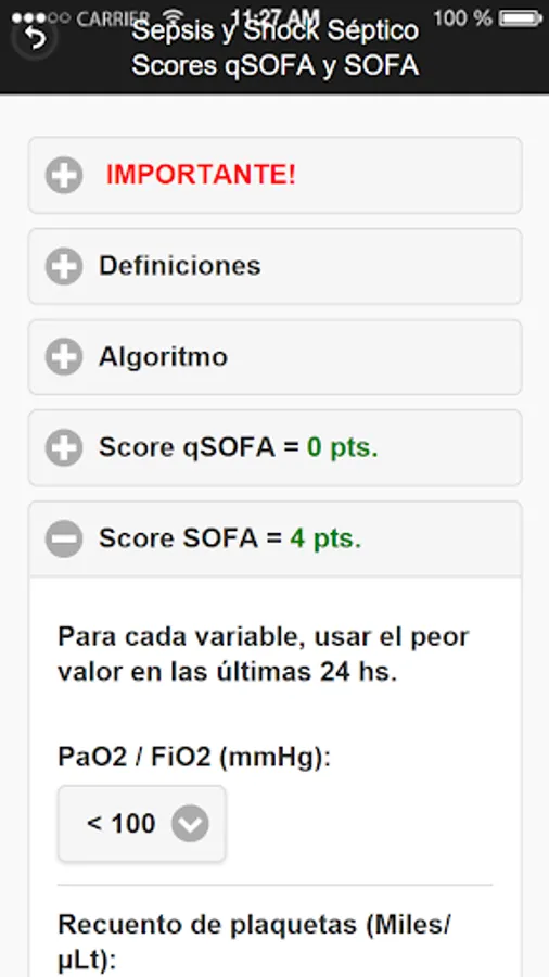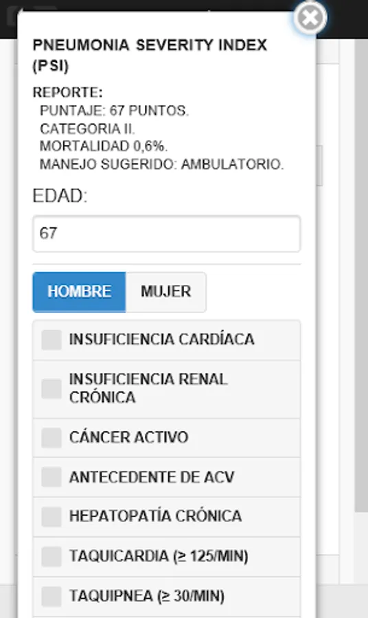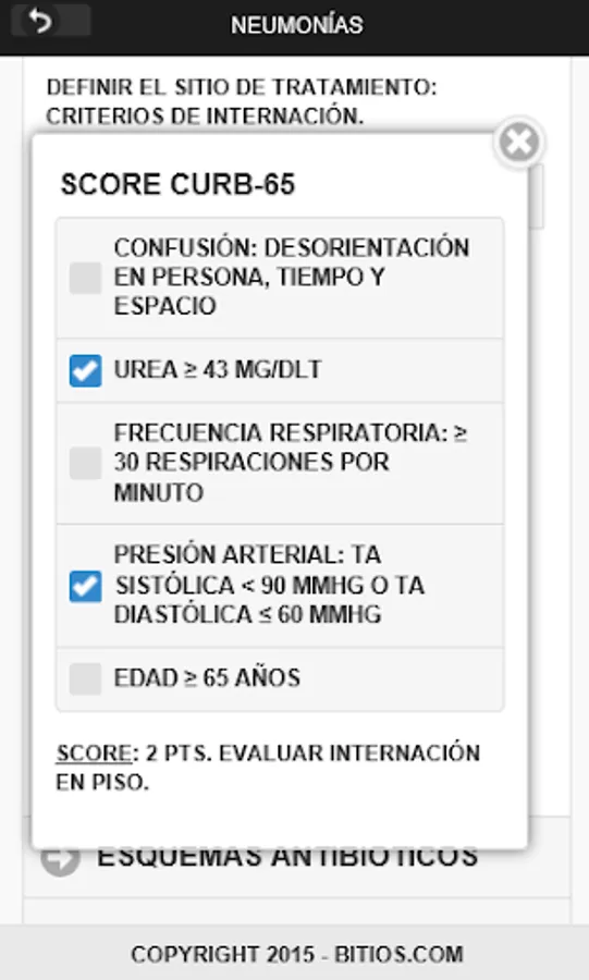 Examples: Thrombolysis in Ischemic Stroke (indications, contraindications, NIHSS), pneumonia (Determination of type, calculation CURB65 and PSI, choice of site treatment: outpatient, flat or intensive care, antibiotic regimen recommended by practice guidelines), Intoxication Carbon monoxide Algorithm management of an asthma attack (with estimate of Peak Flow expected) management Ketoacidosis and hyperosmolar state nonketotic, estimation of GFR by the MDRD, scores qSOFA and SOFA, Guide for management dengue, Septic Shock criteria, etc.