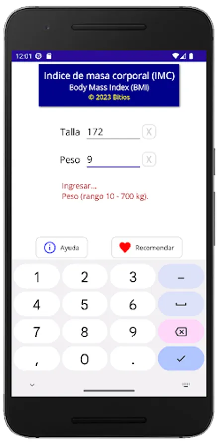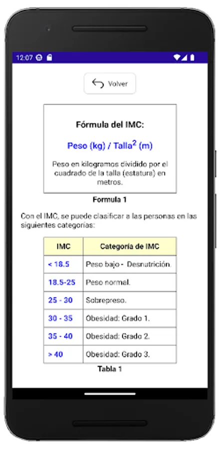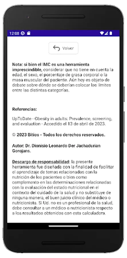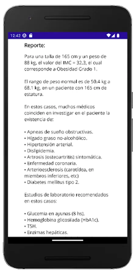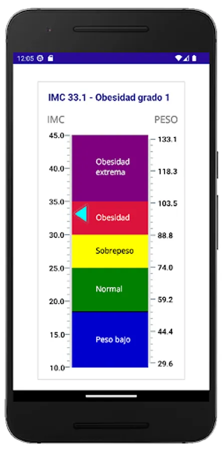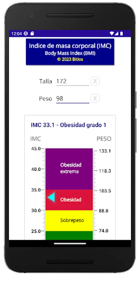 This App allows you to perform the calculation, graph a map where the calculated BMI is located, in relation to the different BMI categories and generate a written report, with recommendations according to the results obtained in the calculation.