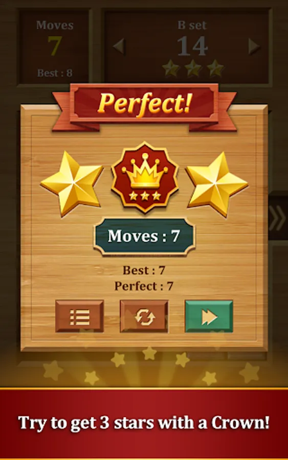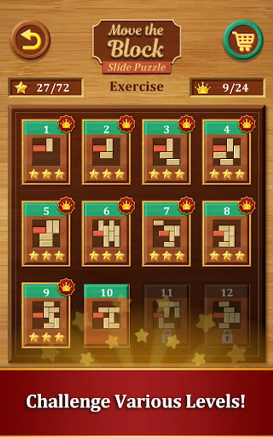 Get the red block out of a 6x6 grid full of wooden blocks by moving the other blocks out of its way. Solve each stage without any hints to earn 3 stars and a super crown!
