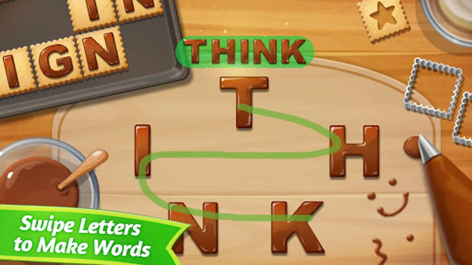 • Swipe the alphabet cookies to complete the crossword grid on the baking pan.