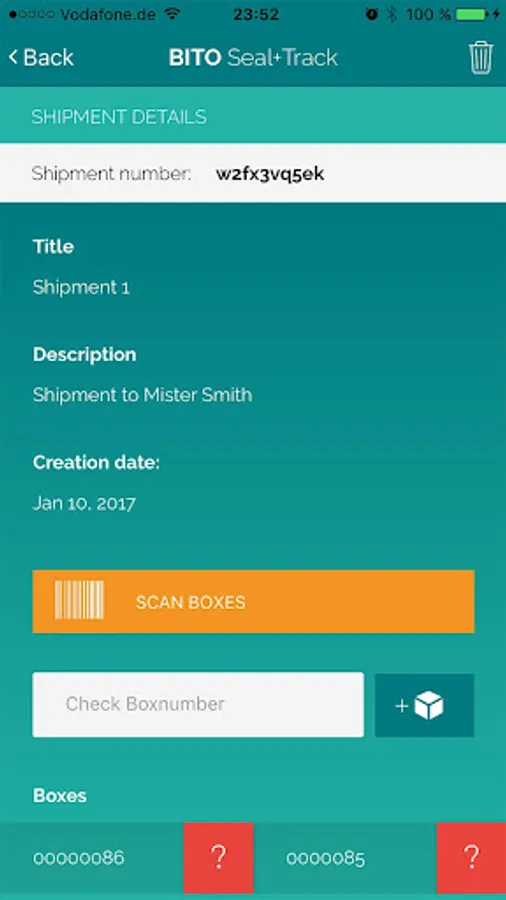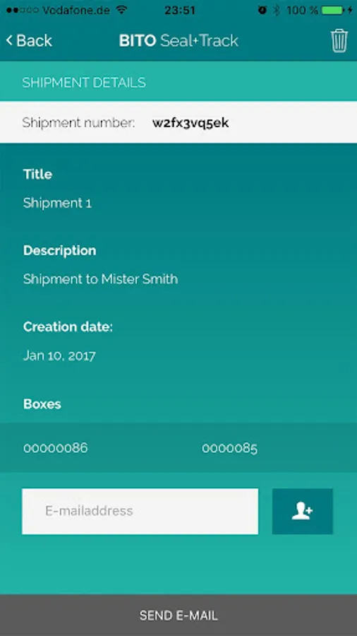 The shipper then sends an e-mail to the recipient with a link that displays all scanned code numbers. The receiver can also download the numbers into his app on his smartphone.