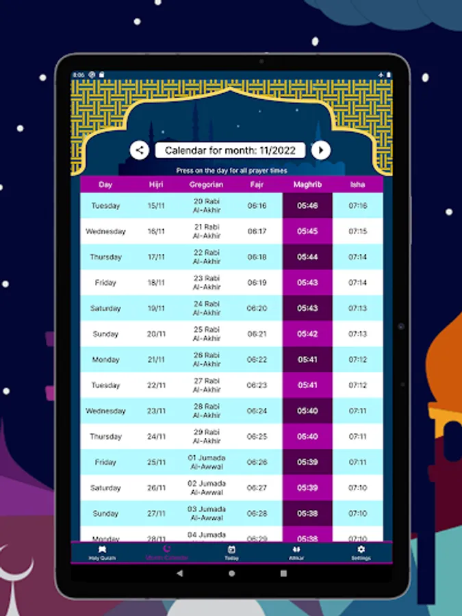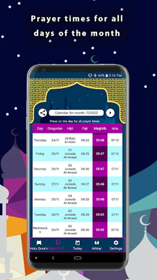 - From the "Whole Month" section you can share the prayer times of the entire month as an image with people in your local area. Be aware that the timing in the generated image is made for the location that you are using in the app settings, and prayer times might be different for people in far areas, so you have to take that into consideration when sharing.