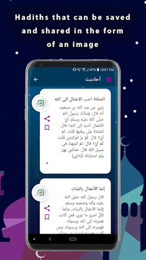 - You'll also be able to read Hadeeth, bookmark, and share them with the ability to customize the image before sharing.
