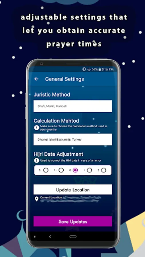- First of all, you'll be able to check prayer times for the current day, and the prayer times for the entire month. The app will use your device location and you'll be able to choose from multiple different Islamic schools and methods of calculation in the settings to ensure highly accurate timings customized for you. You can also change these settings or update your location at any time, and get new values immediately.