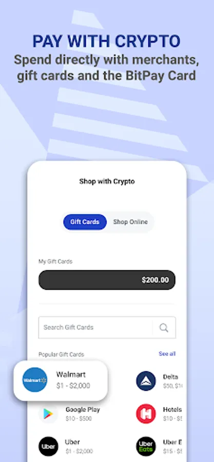 BitPay gives you tons of ways to spend your crypto. Use crypto to buy gift cards for over 100 brands and retailers or even spend your crypto directly with one of our merchants. Catch a movie at an AMC theater, grab the latest accessory at Shop.com, or even pay a bill with AT&T. BitPay lets you do it all!