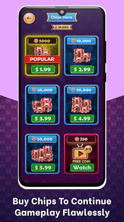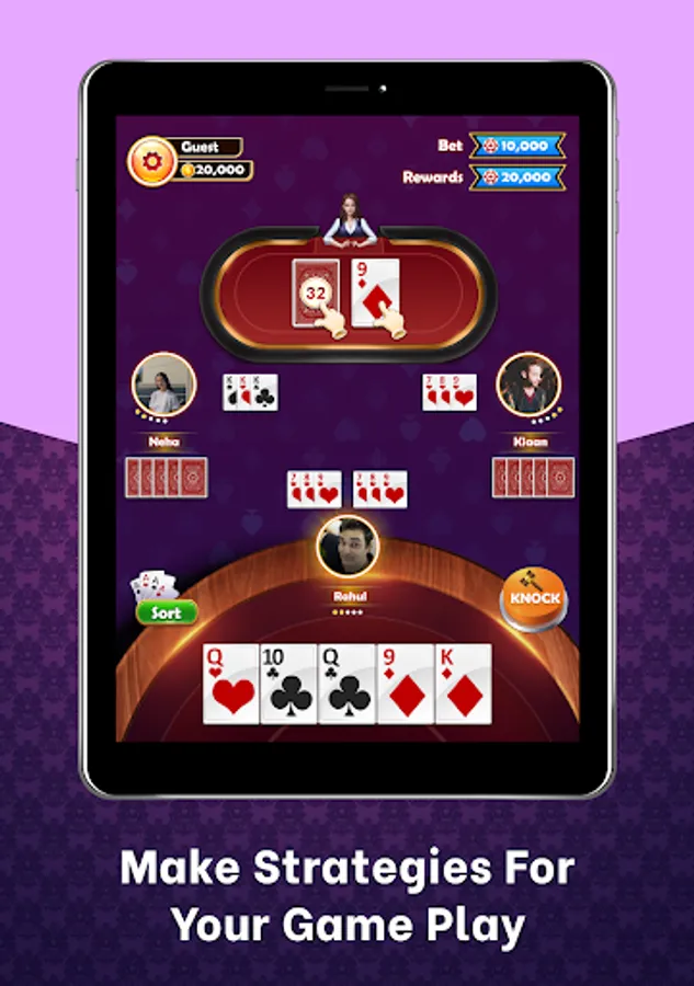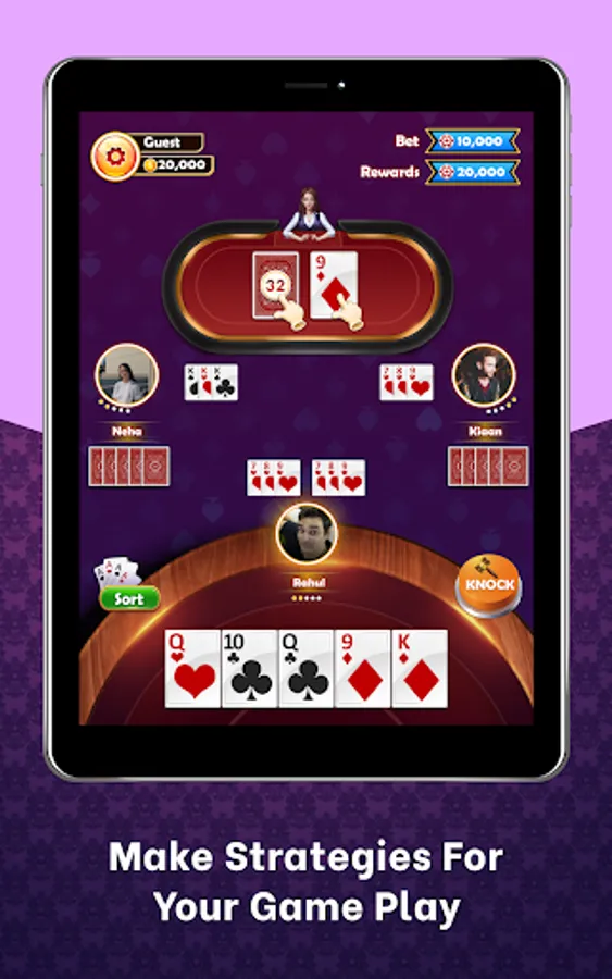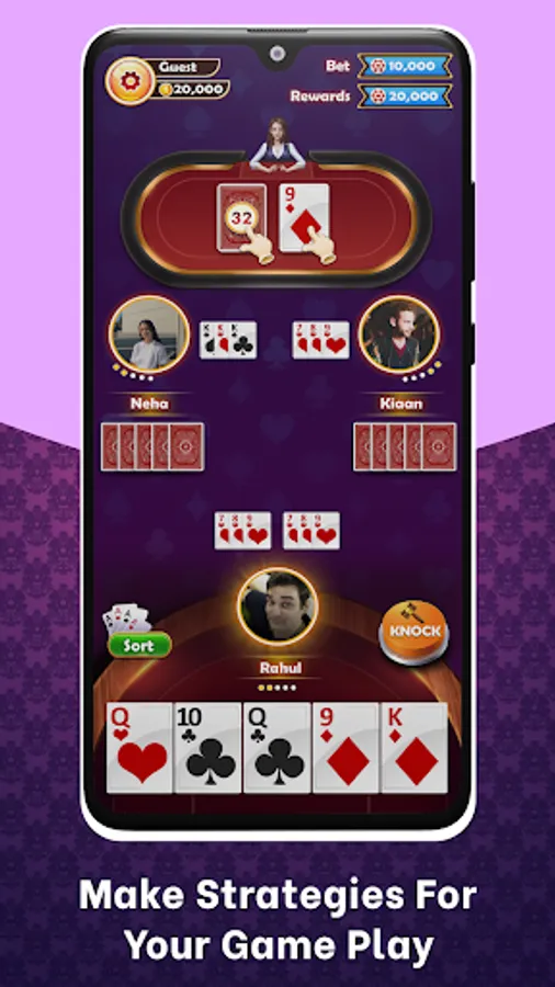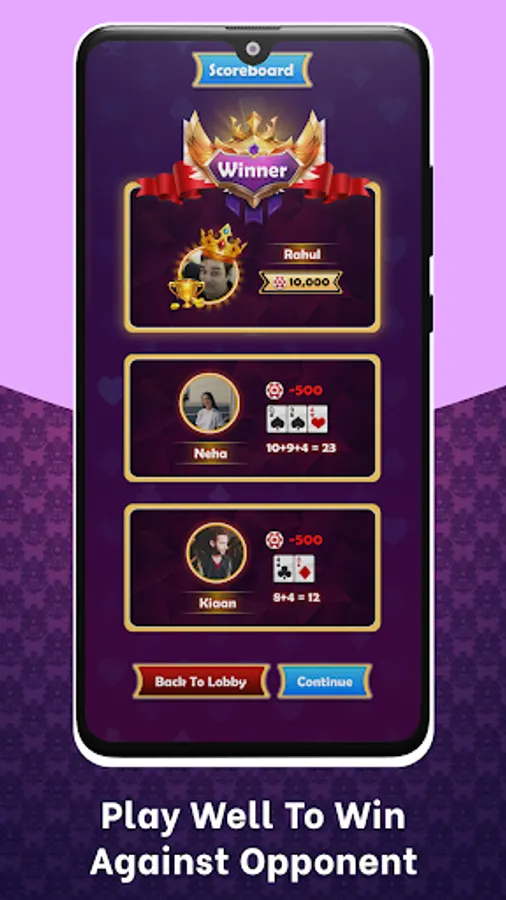 Each card have its unique value. Ace have point 1 and King have point 10. If you feel that you have less no of point compare to all other player, then you can tap on Knock button face-up card of all user. A player wins a round whose card's sum is lesser than all player's card.