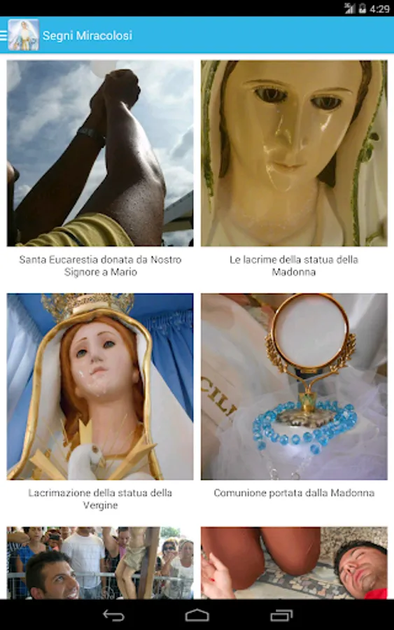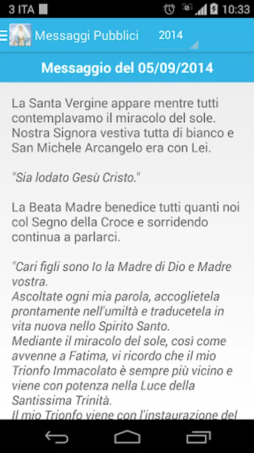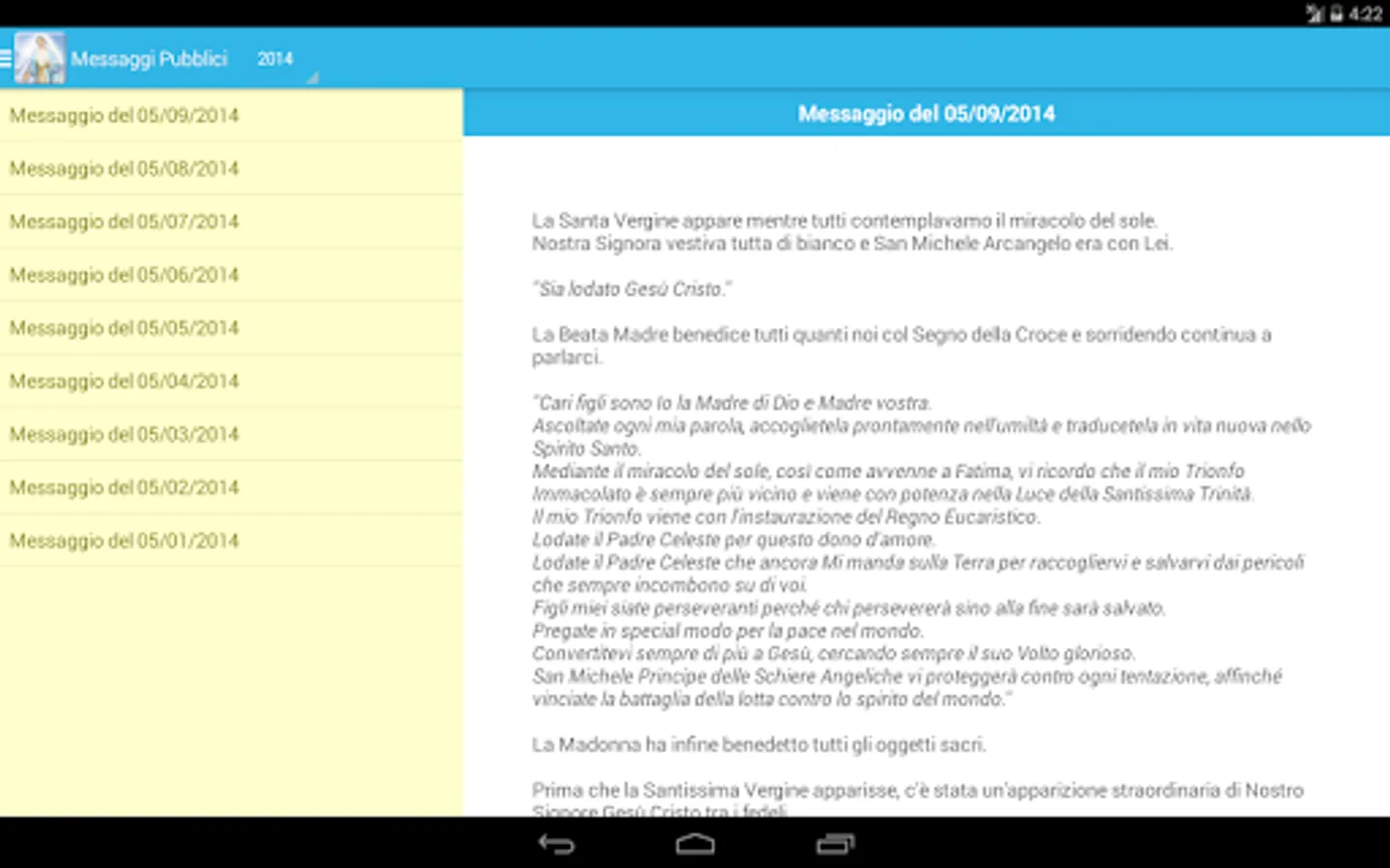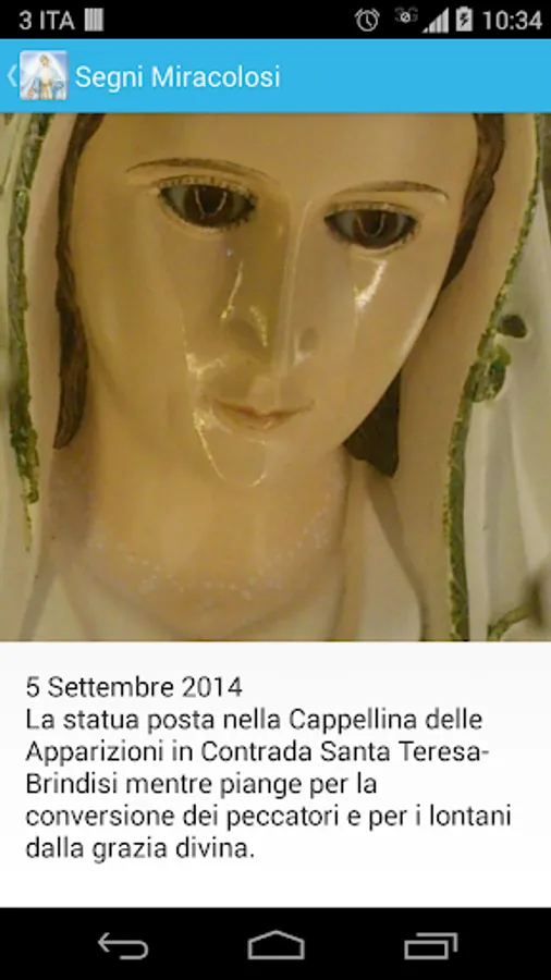The application contains the messages that the Virgin of Reconciliation leaves to the young Mario, her confidant in Contrada S. Teresa di Brindisi.