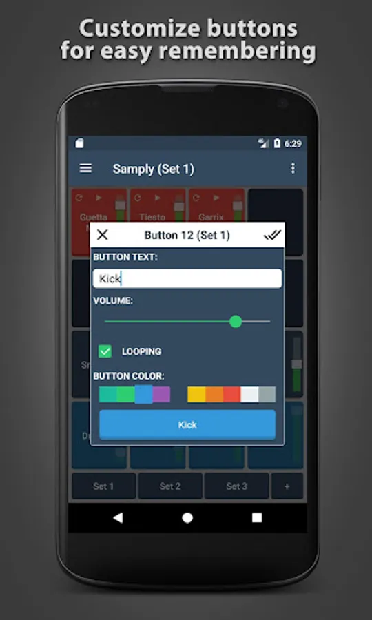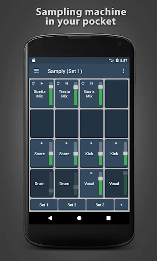 We are happy to bring out the new Samply - DJ Sampler 2.0 version with loads of new features and improved performance. It contains 16 different buttons. You can load different sample to each button by holding the button for few seconds. All you have to do is transfer your samples to your device storage or just download them from cloud (10.000+ free samples) with integrated download dialog. You have multiple sets which you can switch between during the performance. Each button has its own settings and you can control looping and volume on each sample. That means if you have 6 different sets you can control the looping and volume of 96 different samples at once. With the new Audio Engine, your samples will play without any problems or lags (application supports mp3, aac and wav files). You can easily save your work and load it any time you need. We also added colors to buttons to avoid monotony. You can activate different actions to your sample with different gestures on the button itself, for example swiping the button down to toggle the sample looping. Also each button has its own text, so you can set different text to every button in all of the sets.
