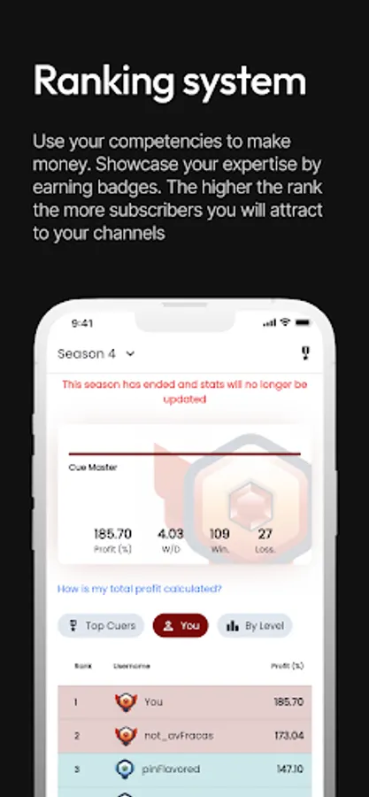 * Ranking system: Participate in 4-month ranking seasons, rank up and earn badges! Ranking system features 9 levels: Iron, Bronze, Silver, Gold, Platinum, Diamond, Diamond Plus, Master and Cue Master. At the beginning of every season, users will start from Iron rank and based on the total profit they make, they will make it to different ranks