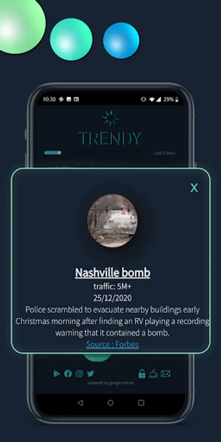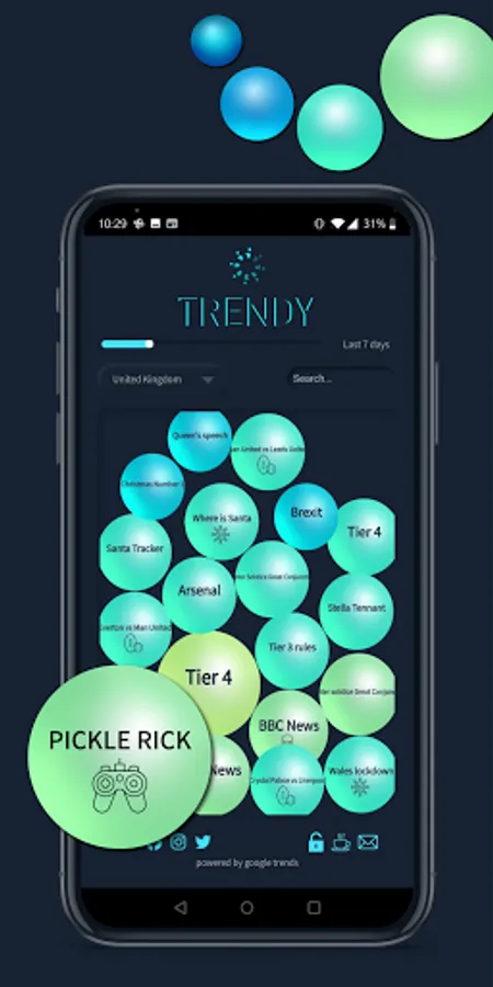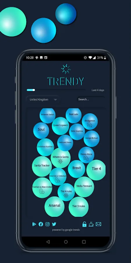 Trendy - Trending Search Analyzer app, filters out trending posts, topics and information based on what people are searching around you! Trendy App displays all trending searches and topics in a unique bubble like format, which helps you determine how trending a particular topic is. The bigger the bubble, the more trending it is!