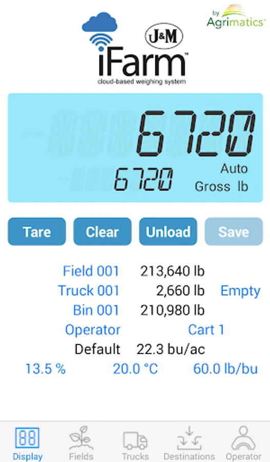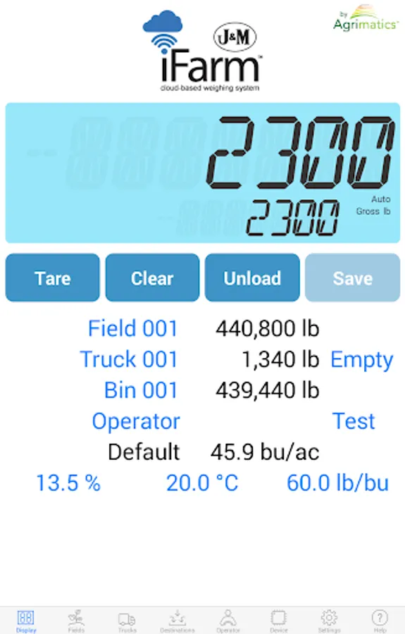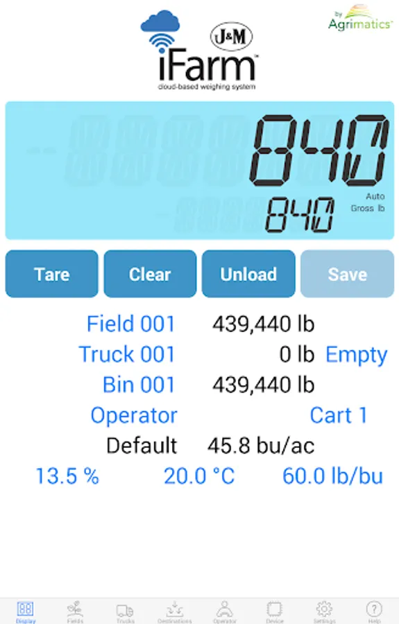 J&M iFarm by Agrimatics is the first tablet and smartphone-based grain cart weighing and data management system. The iFarm app is designed to work with our J&M iFarm by Agrimatics hardware that mounts directly onto your grain cart to wirelessly communicate with the iFarm app running on your smartphone or tablet inside the tractor. Automatically capture harvest data and share with the touch of a button. This app provides all of the capabilities that you would want in a grain cart scale indicator plus more:
