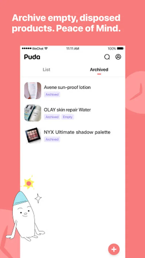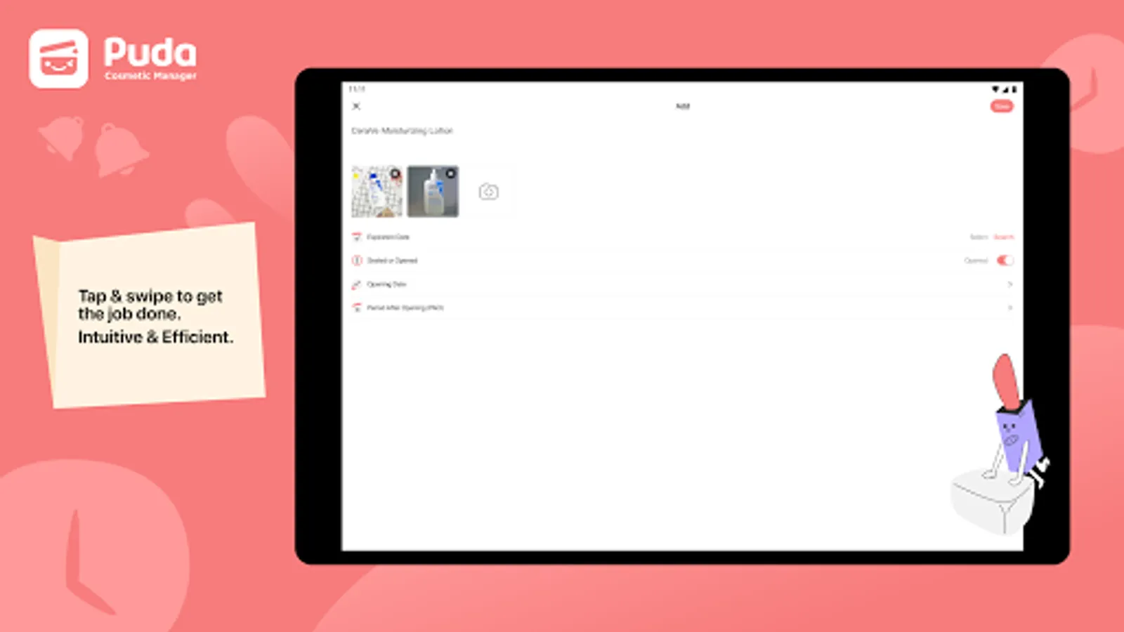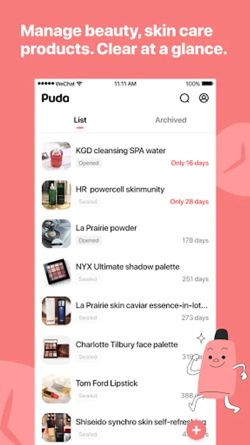 [AIO Management] You can add and manage cosmetics effortlessly with Puda. If you run out of cosmetics or decide not to use them anymore, just easily move them off your list and archive them. You can add notes, comments or usage tips for every easy retrieval.