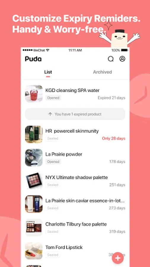 [Batch Code Inquiry] Some cosmetic products do not indicate the date of manufacture or the Expiration Date, which is difficult to manage. With Puda, you can easily check the Expiration Dates of over 500 products from every and even niche brands by their batch codes. After getting the Expiry Dates, simply add them to your list, so that you can see at a glance which products are about to expire.