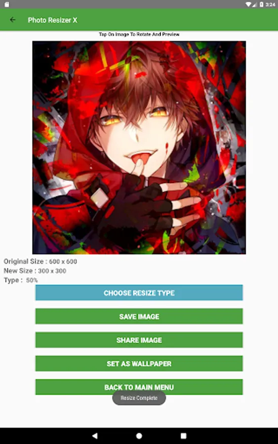 - You can access the Photos that were resized with this Photo resizer in the resized Photos menu screen in order to view, delete, and share your resized Photo.