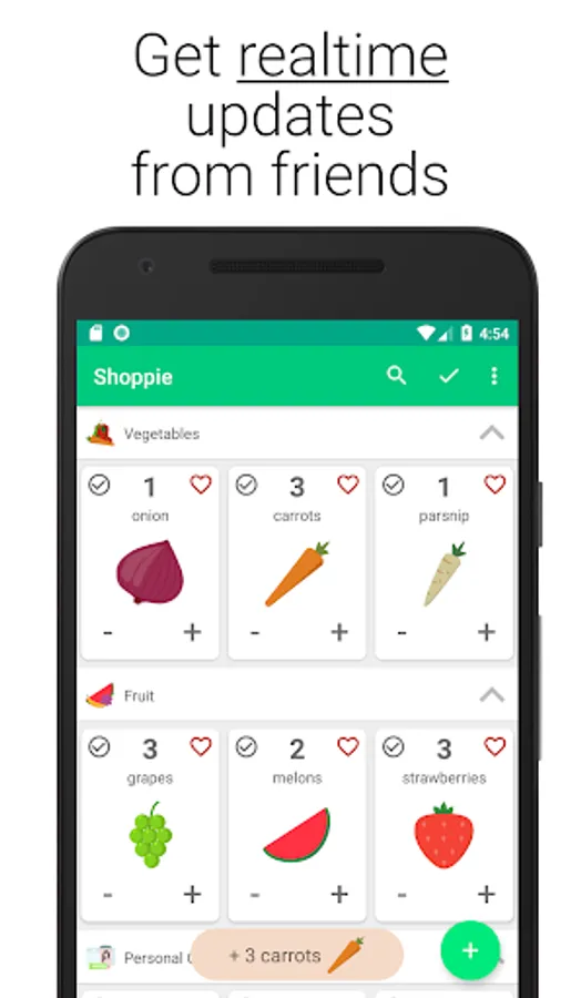 Another clever scenario is multiple people buying groceries for an event. Three or four people can split up in the shop and update the list with what they bought. Everyone will be notified and when everything is bought Shoppie lets everybody know.