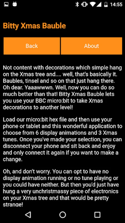 Liven up that Xmas tree! Hang a BBC micro:bit on it and use the Bitty Xmas Bauble app on your phone or tablet to make it display any one of 6 delightful LED animations and play any one of three Xmas tunes.