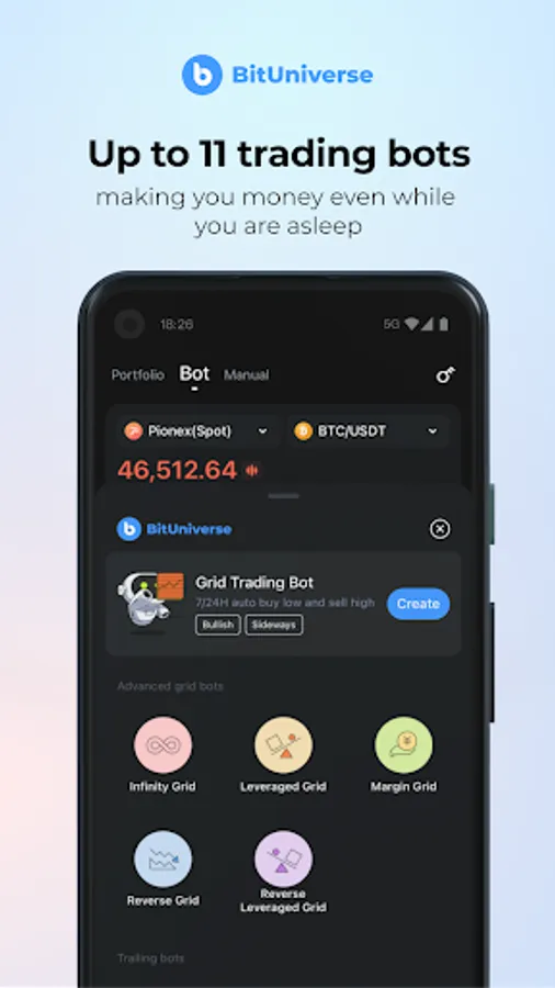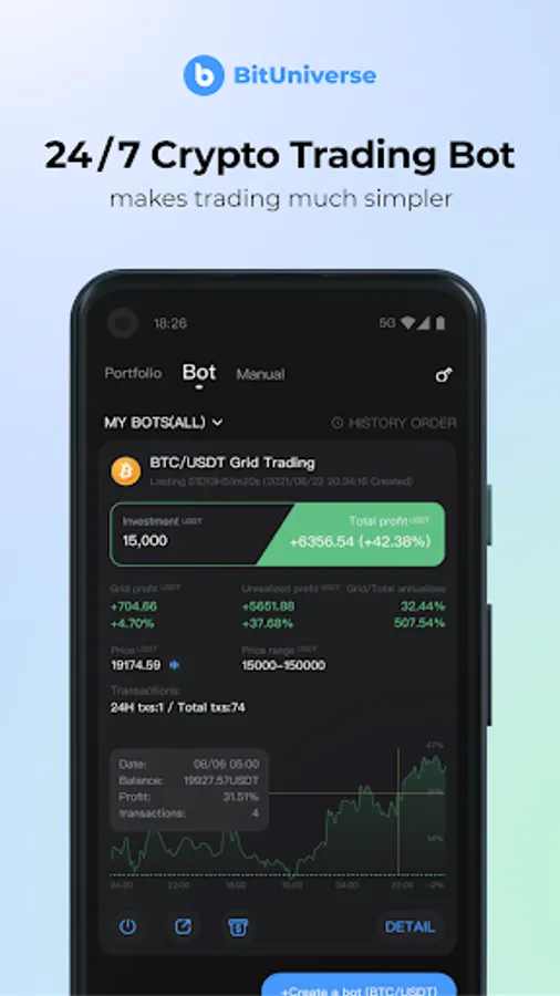Download the mobile app Bituniverse, connect your API keys on exchange, and start to use the automated trading robot for free! You don’t need to transfer your funds to BitUniverse. The average ARR is 100%+, making trading much simpler!