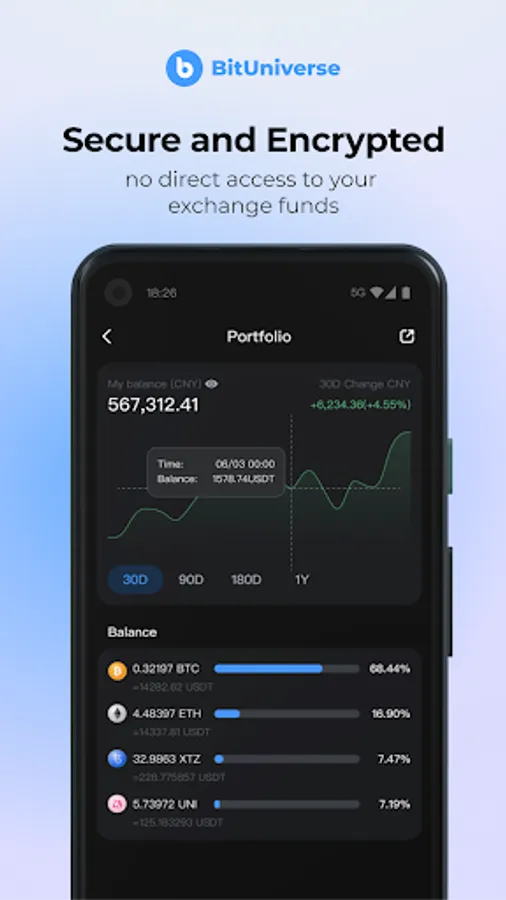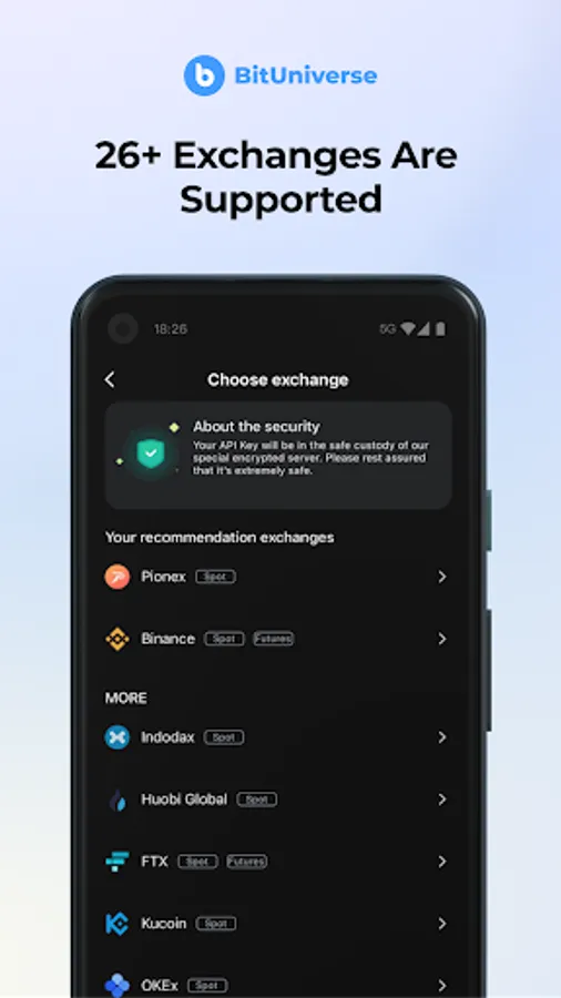 BitUniverse has military-grade security and encryption, and the safety of your funds in exchange is strongly ensured. BitUniverse will never touch your funds directly. Instead, it only uses official exchange APIs to conduct trading.