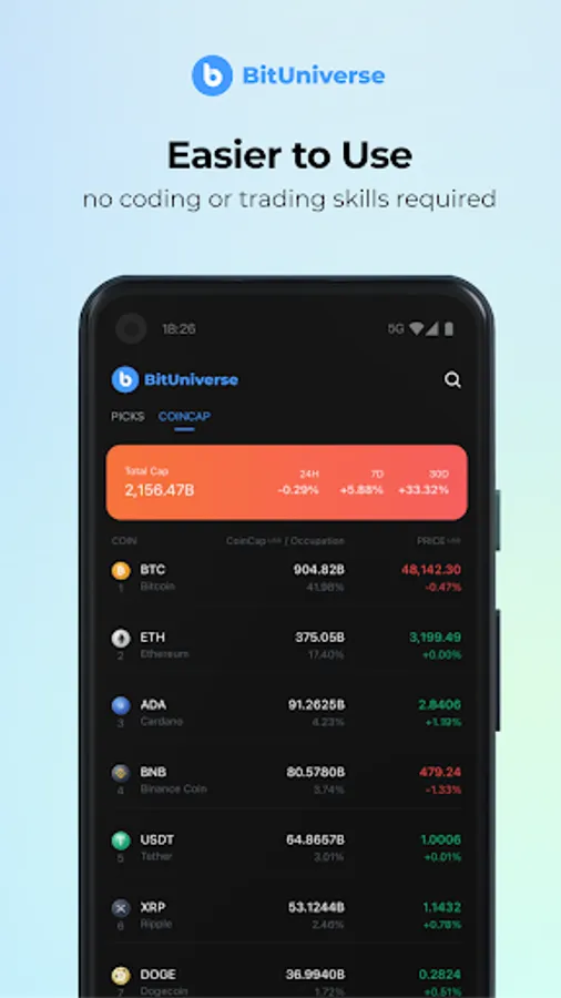 BitUniverse might be the simplest and easiest trading bot to operate. It’s fairly handy to embark on! It helps you conduct trading among over 6000+ cryptos including BitCoin, ETH, and DogeCoin, and you don’t need to be an expert who has a good knowledge of programming and trading strategies.