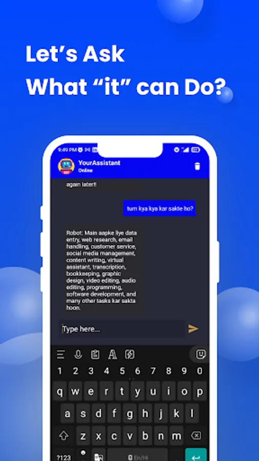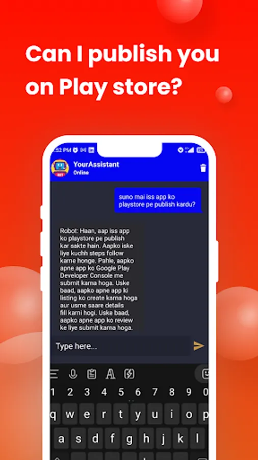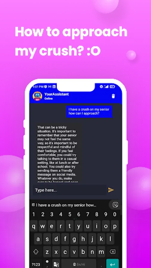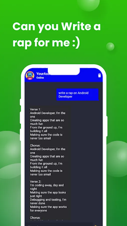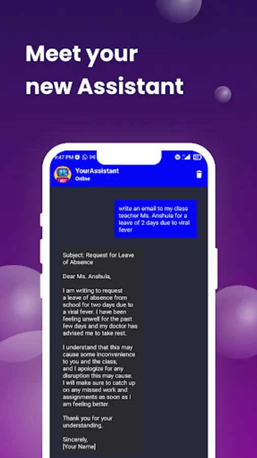 YourAssistant app is your personal assistant chatting bot which will answer all of your queries, all of your even includes writing an email to your hod for a week long leave, or sharing your personal problems, advices recommendations, searching any code you want, understanding concepts and much more!!