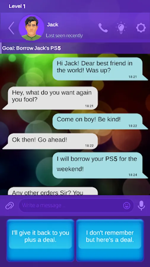 Start chatting with jack and unlock other levels to become a chat master in the game. Most importantly, this chatting game lets you become more ethical in your dialogues with people.