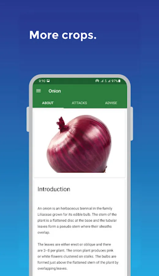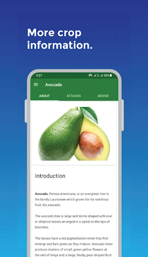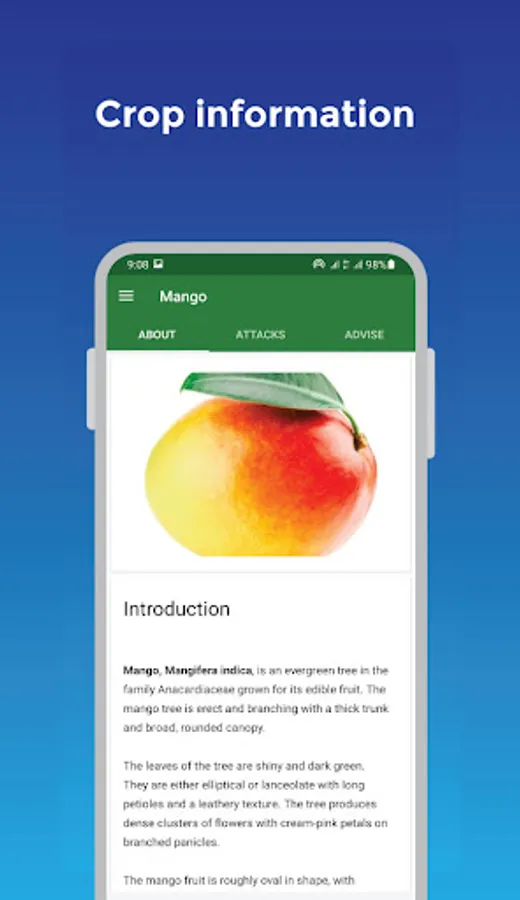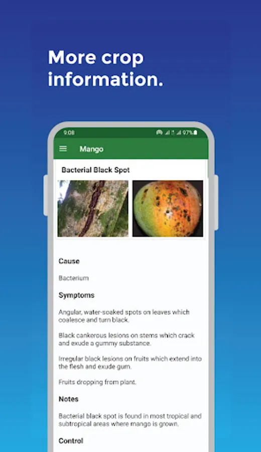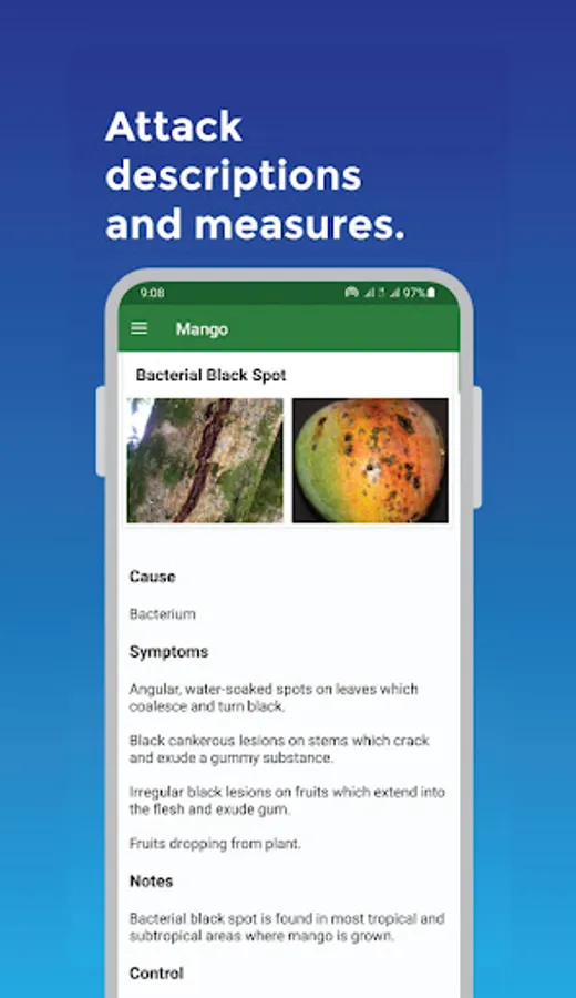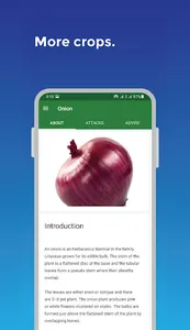 The app also describes attacks such as pests and diseases that are more likely to attack those crops with their causes, symptoms, how they are spread, and preventive and control measures. If applicable, the app advises on suitable farming practices to combat crop pests and diseases.