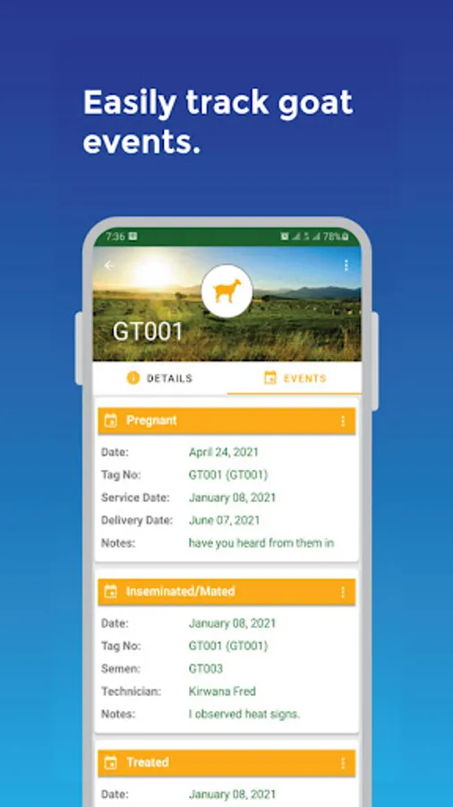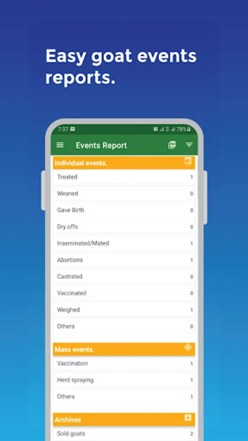 Another important feature of the app is the ability to track both individual and mass goat events such as goat insemination, pregnancies, abortions, treatments, vaccinations, castrations, weighing, spraying, births, and linking kids to their dams and sires. After tracking these events, the app gives you a report for these goat events within any specified/ desired period.