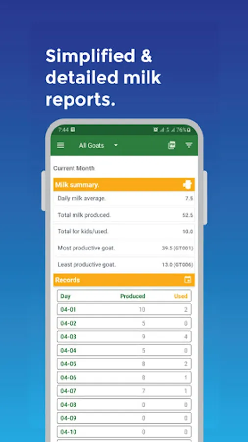 An app for goat farmers to manage their goat farming. Tracks and records farm goat events, milk production, income, and expenses. It generates both visual and pdf reports on the fly.