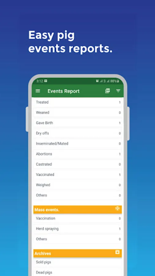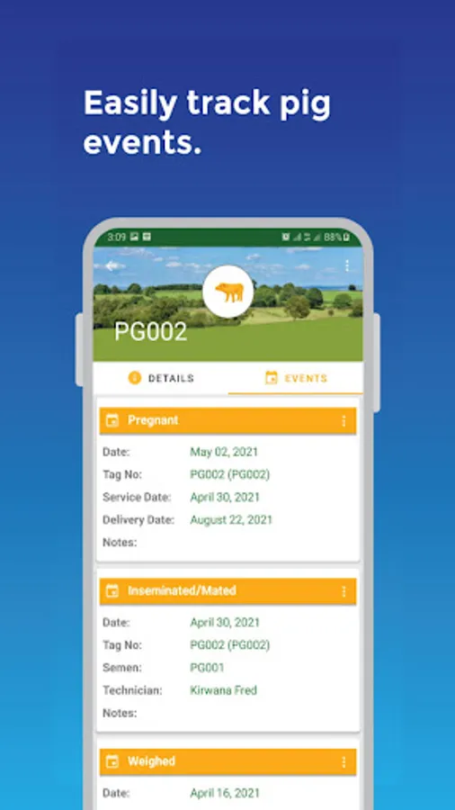 • Record and track pig events such as birth, treatments, inseminations, etc.