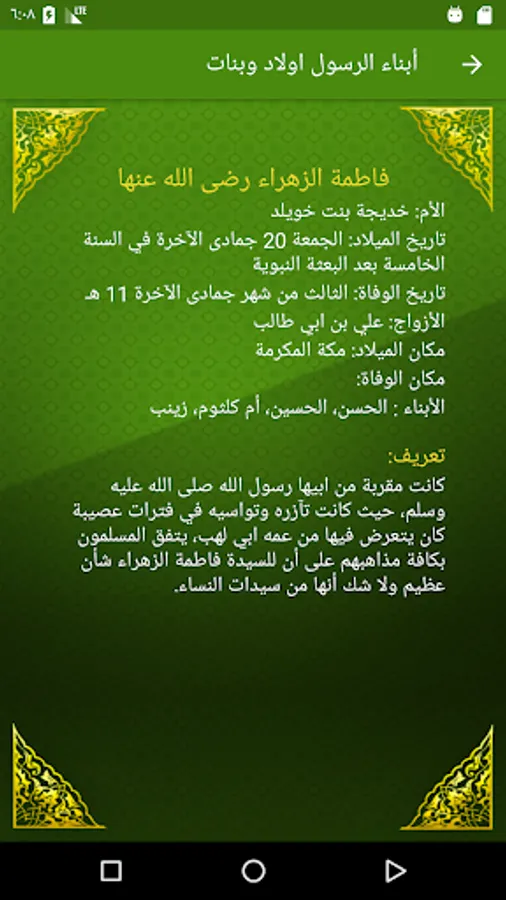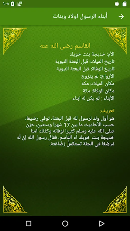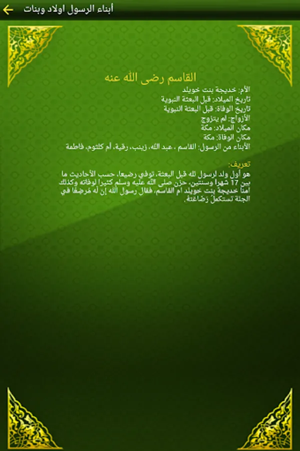 Often ask about the people of the Prophet and how many sons and who is no wife of his wives, and when they were born and where you were born and how long had died ... all these questions find her answer in this application, the sons of the Prophet beloved seven on the whole, we leave you the opportunity to be familiar with all one of them.