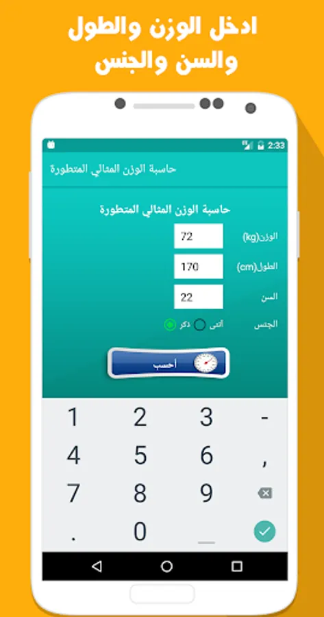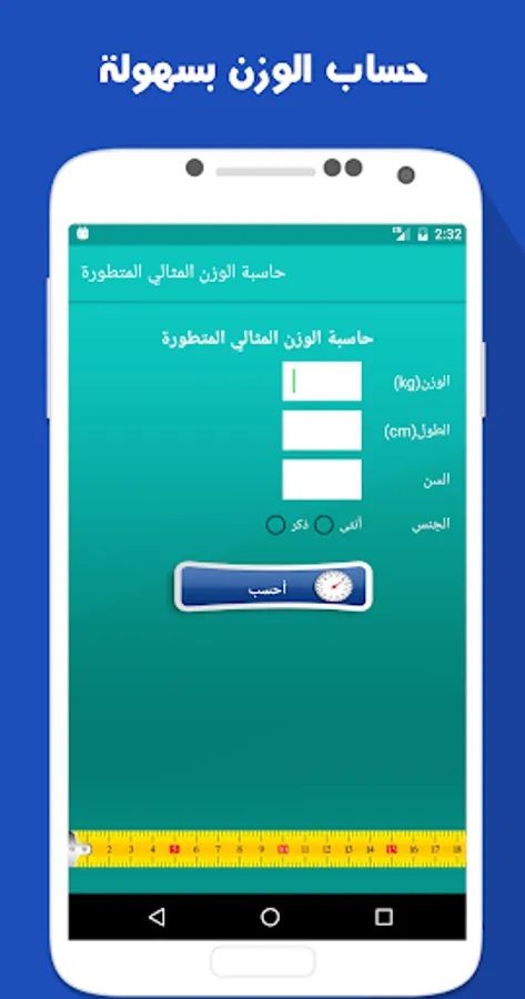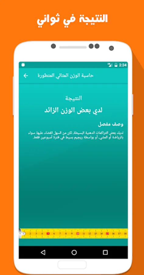 Due to the small number of applications that provide users health information concerned with the problems of obesity or thinness, we have put between your hands application that you read about now, you can calculate the ideal weight by introducing weight, height, age and sex, and receives the result, the result is written give comments clear all weight, do you suffer from obesity ... as you find some information about your weight and how you behave, both of exercise or follow a suitable diet or surgery if needed.